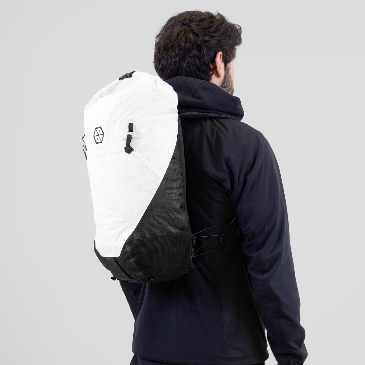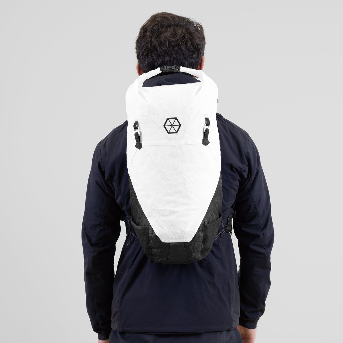 軽量性と耐久性、防水性のためDyneemaを本体に採用し、ショルダーハーネスのフィッティングはダイヤル式の”atop”を採用。チェストストラップは上下2か所止め。下側はストレッチコード仕様。ロールトップ式の広い開口とフルシーム処理で、高防水性を誇ります。