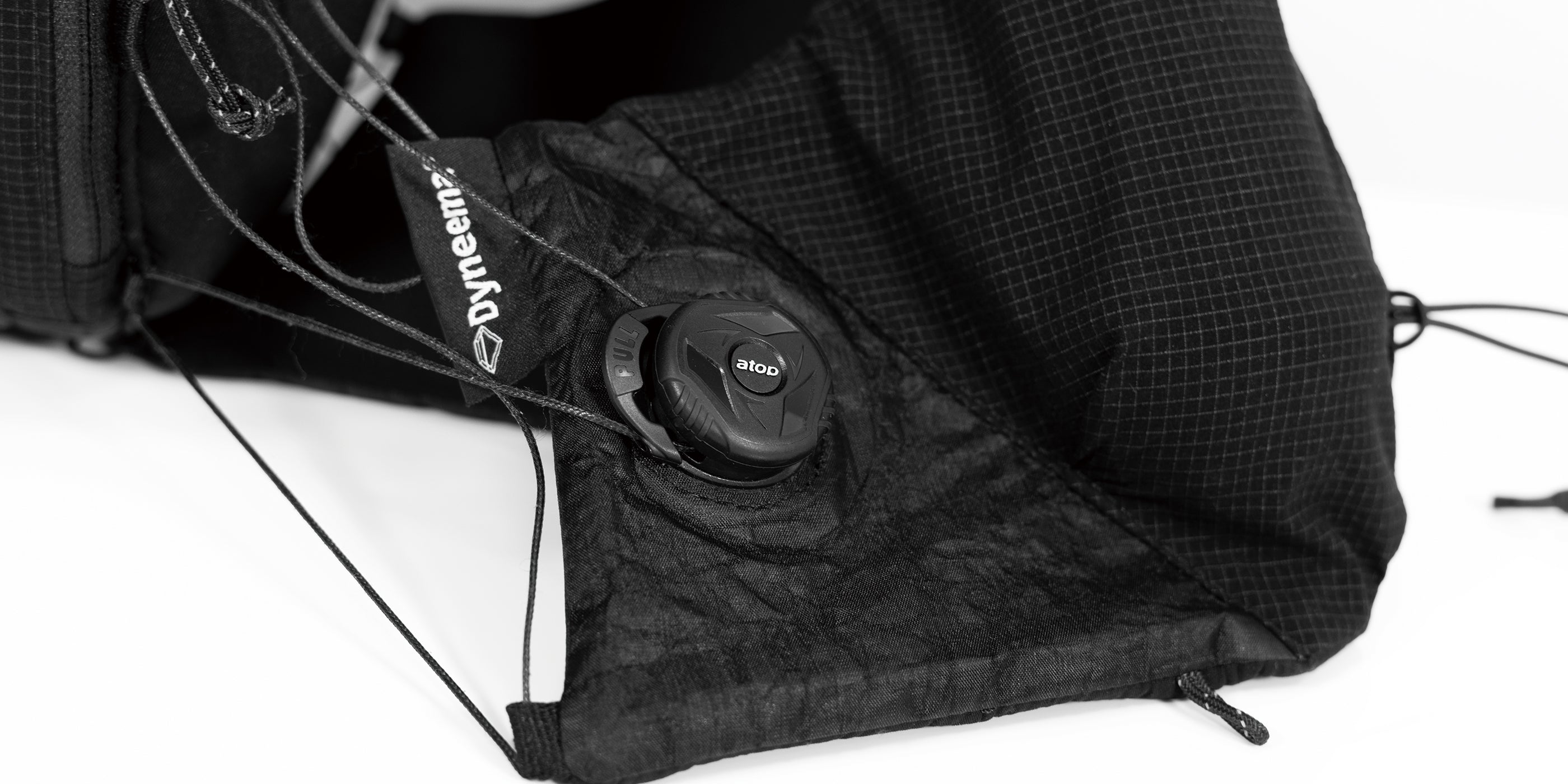 軽量性と耐久性、防水性のためDyneemaを本体に採用し、ショルダーハーネスのフィッティングはダイヤル式の”atop”を採用。チェストストラップは上下2か所止め。下側はストレッチコード仕様。ロールトップ式の広い開口とフルシーム処理で、高防水性を誇ります。