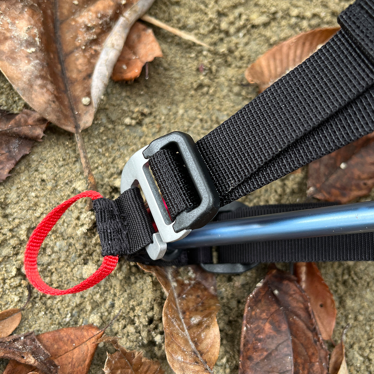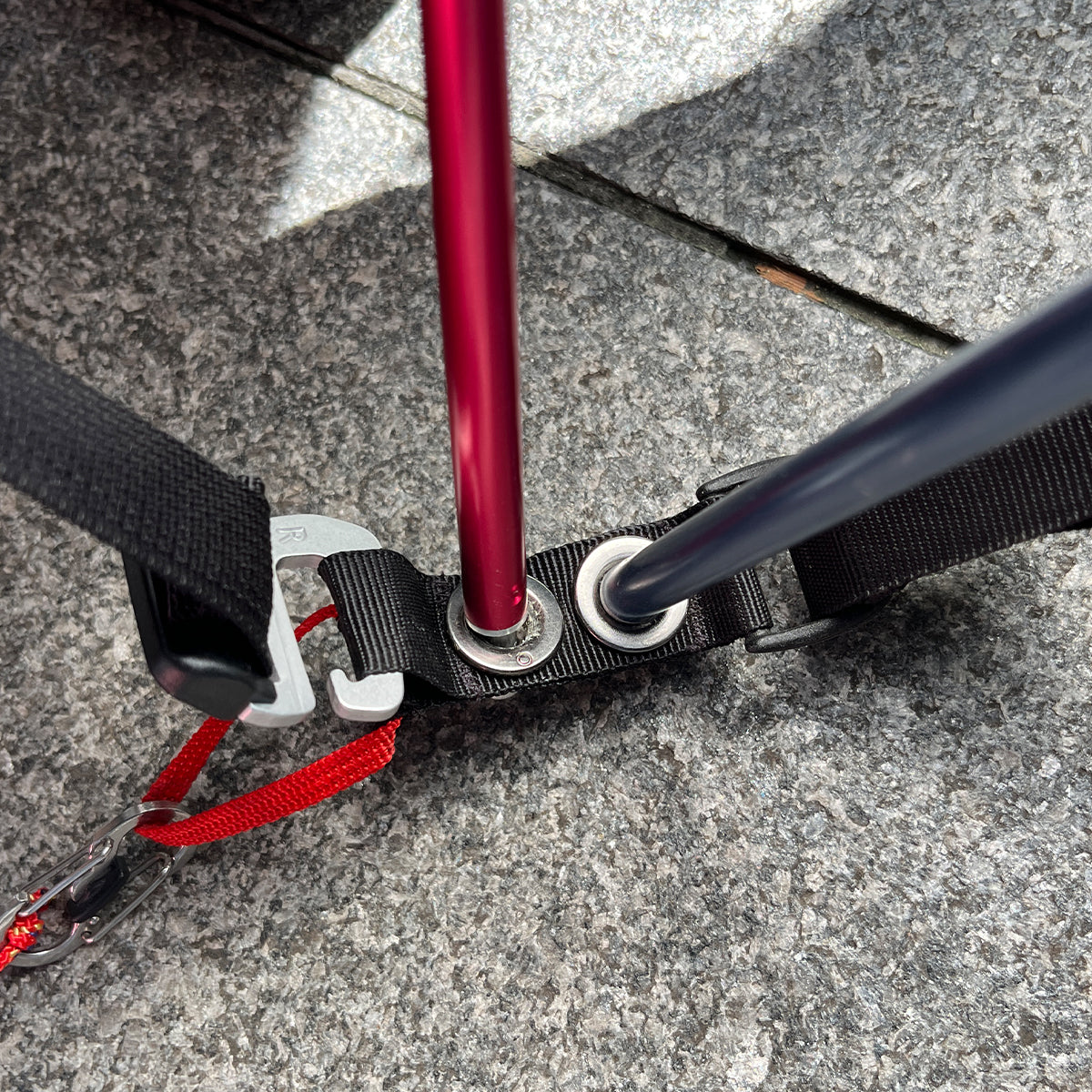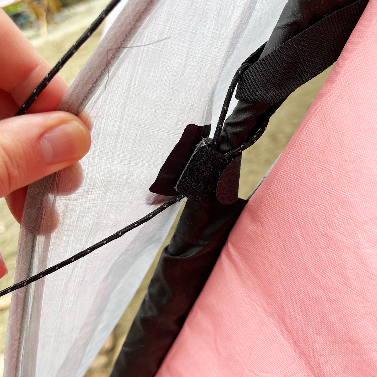 テント本体のポール(ガンメタルカラー)に片側3箇所ずつベルクロで固定する。